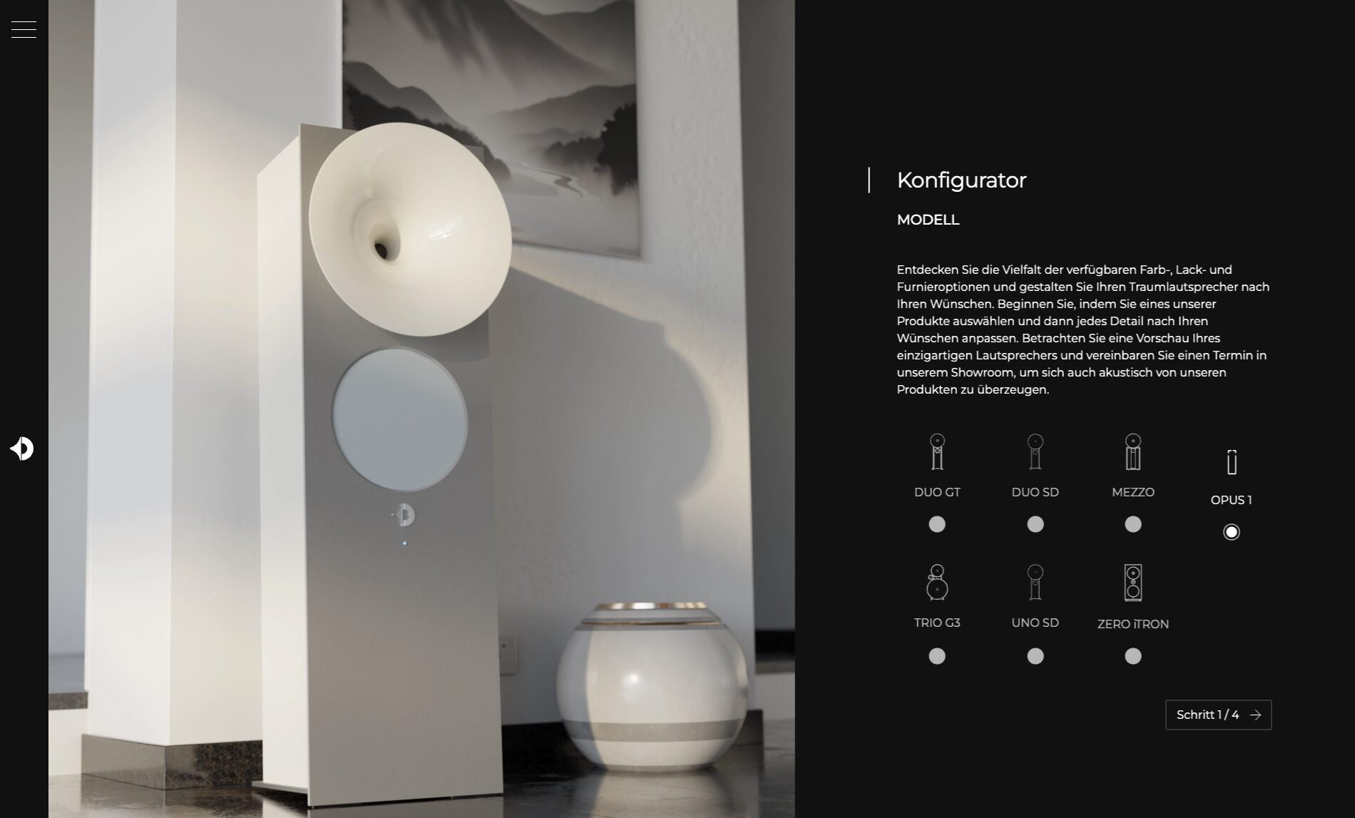 At the heart of the platform: an interactive configurator. Customers select their model—from the sculptural TRIO G3 to the compact UNO SD—choose from a range of lacquers and wood finishes, and watch their dream speaker come to life in real time.